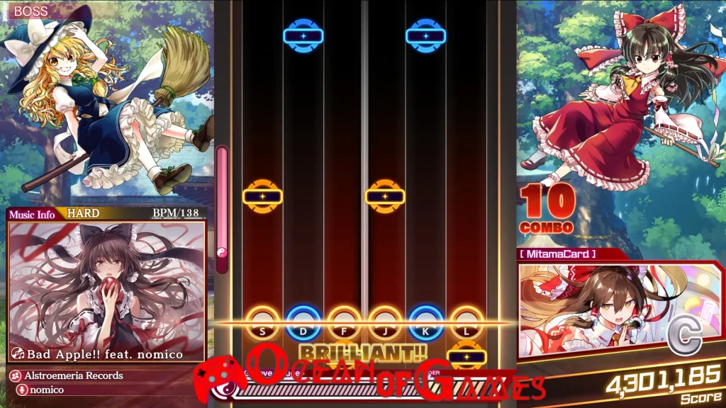 - Two Rhythm Game Modes: The game features two distinct modes: Kagura Stage, where players hit notes in six lanes to build combos and score high, and Danmaku Stage, which combines shoot ’em up mechanics with rhythm gameplay.